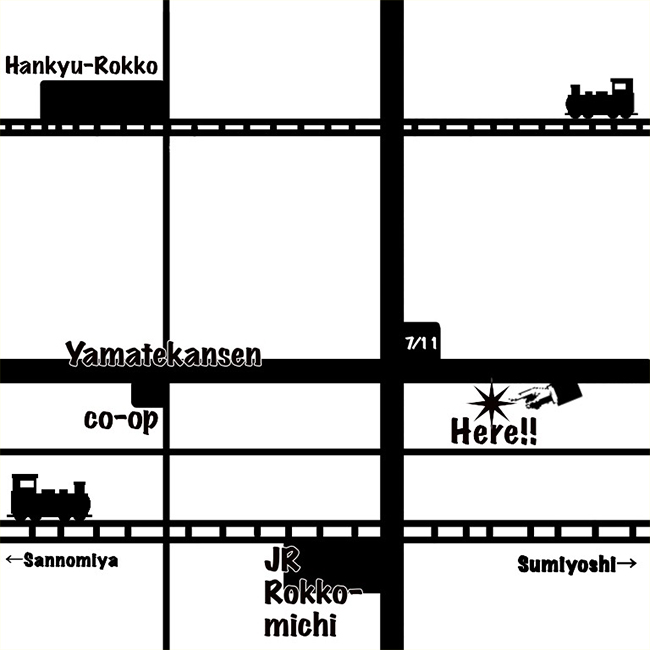 KQ(ケーキュー)はJR六甲道駅を北側に4分ほどの3階建ビルで